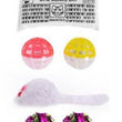 The White toy pack contains a catnip play bag, 2 plastic balls with bell, 2 scrunch balls and a toy mouse. The colour refers to the catnip play bag.